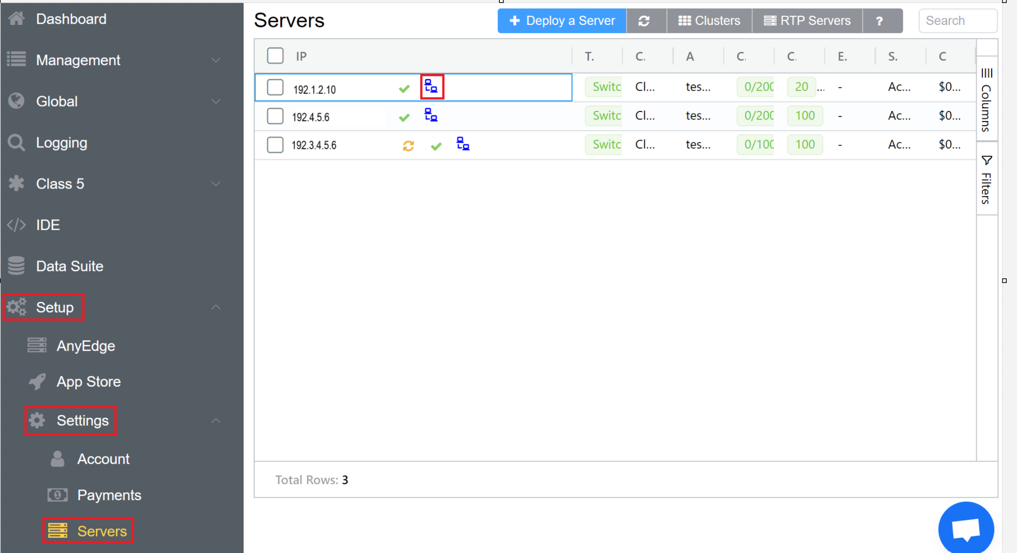 - IP: The unique server IP address. To view SIP and ICMP latency, hover over the status icon next to the server IP.