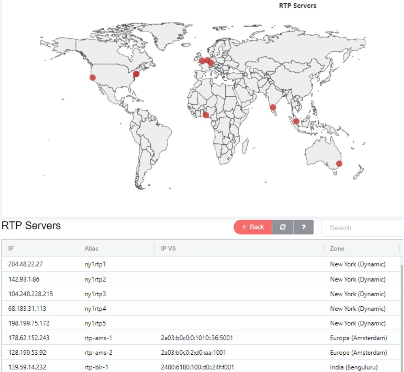 RTP Servers.A list of your current RTP servers appears, with columns for IP address, aliases, and zones.