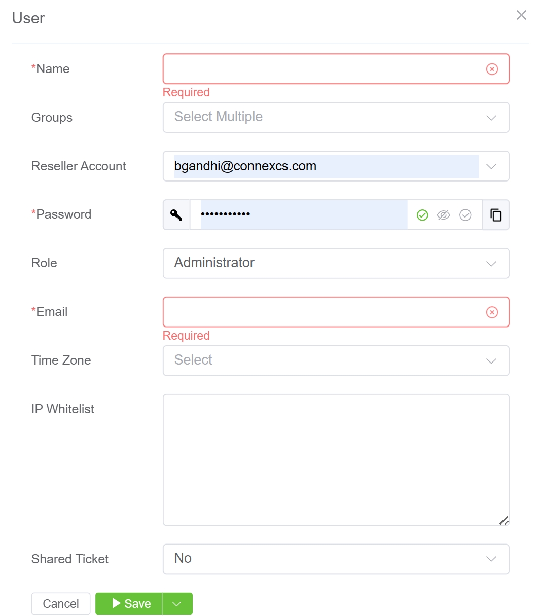IP Whitelist: Specify the IP or range of IPs this user can use to connect to the ConnexCS Control Panel.