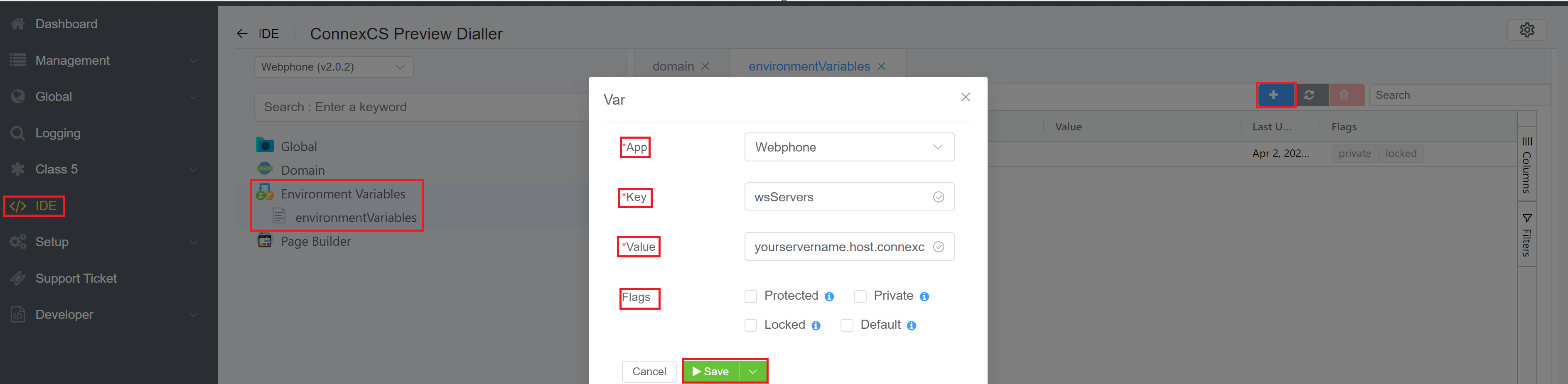 - A window will pop-up, where you need to enter the key as wsServers (example value) and value as yourservername.host.connexcs.net (example value). These values and will appear in the drop-down on the Webphone login-page.