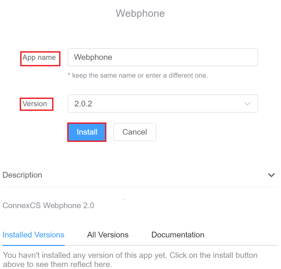 - After hitting the Install button. A window appears which has 2 fields, App Name and Version. We shall keep the default App name and the suggested version of the App.